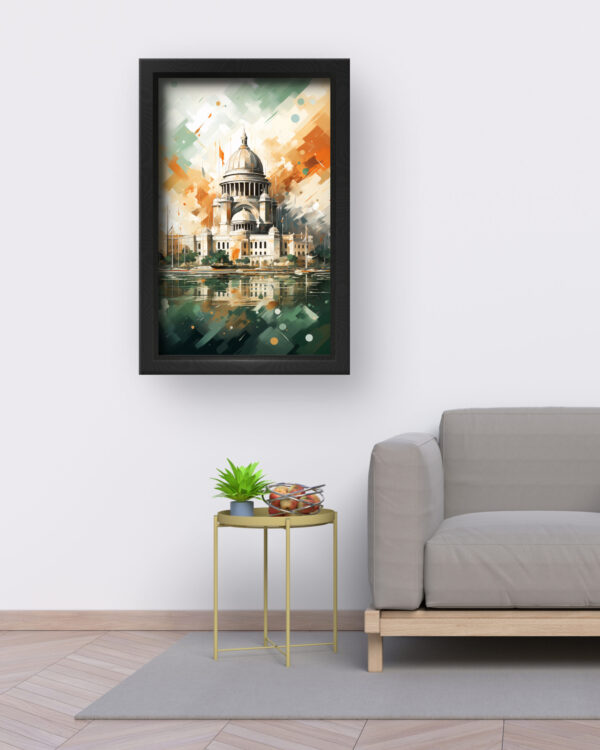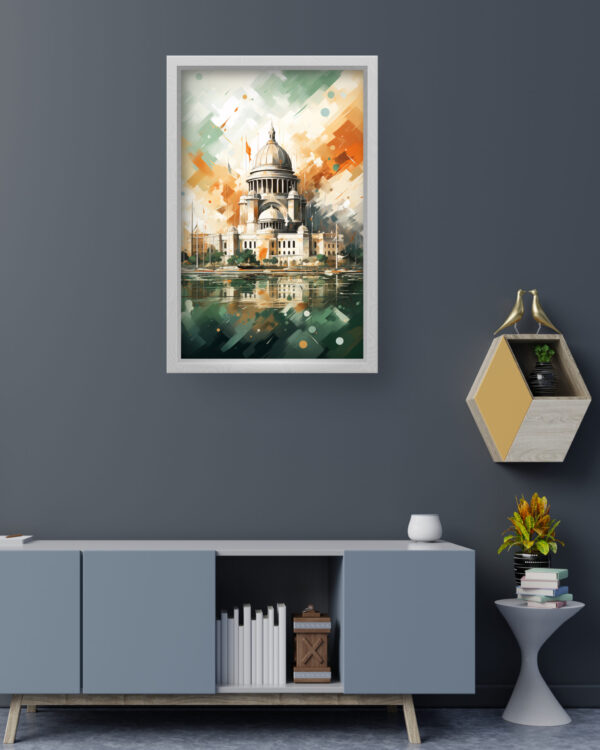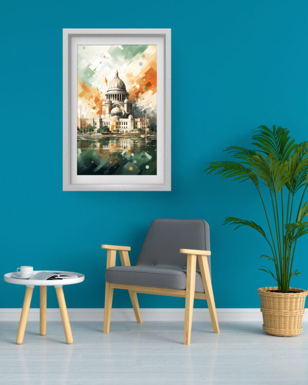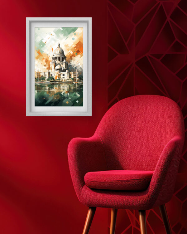 This breathtaking artwork captures the elegance of St. Paul’s Cathedral in a dynamic abstract style, merging classic architectural beauty with modern digital artistry. The fluid brush strokes and geometric accents create a visually engaging piece that feels both timeless and innovative. The harmonious blend of green, orange, and beige tones evokes a sense of depth and movement, making this canvas an exquisite focal point for any living space or office. Perfect for art lovers and admirers of London’s iconic landmarks, this print brings a sophisticated and creative touch to your decor.