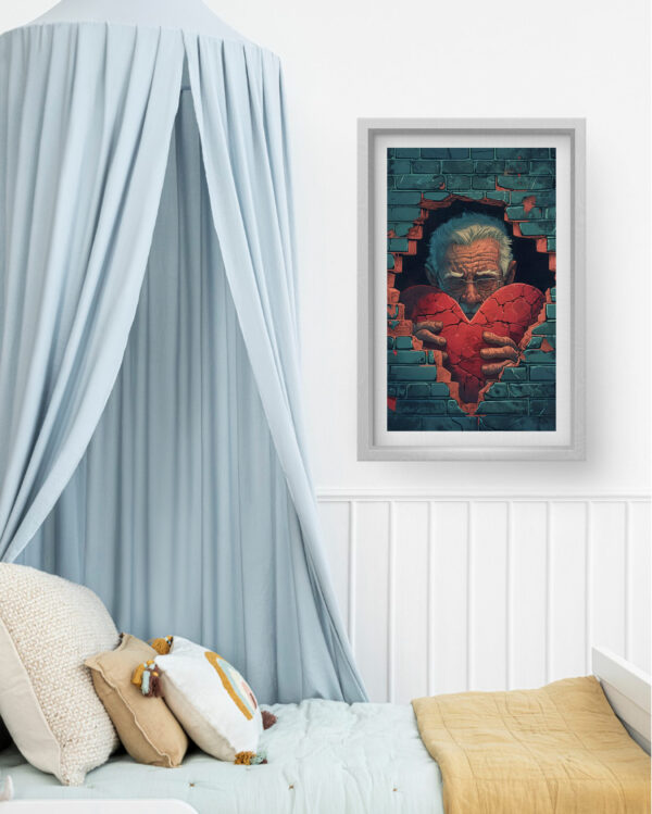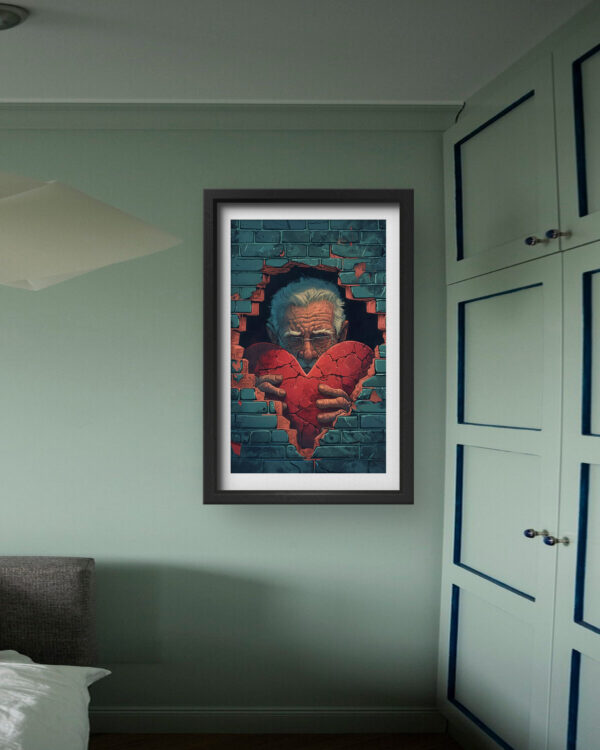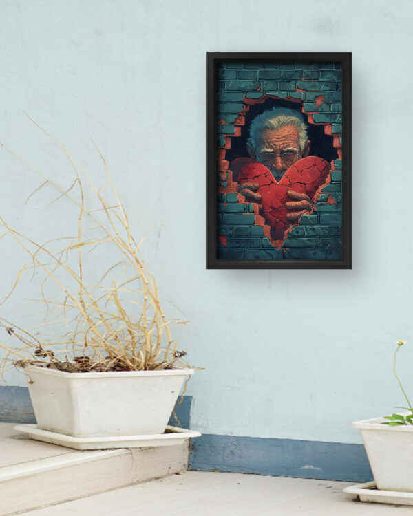 Broken Heart Remains Wall Art captures raw emotion and the passage of time through a striking visual narrative. The artwork features an elderly figure breaking through a crumbling wall, holding a fragmented heart, symbolizing pain, endurance, and the scars of life. The mix of deep reds, muted blues, and textured details creates a thought-provoking and intense composition.