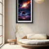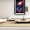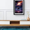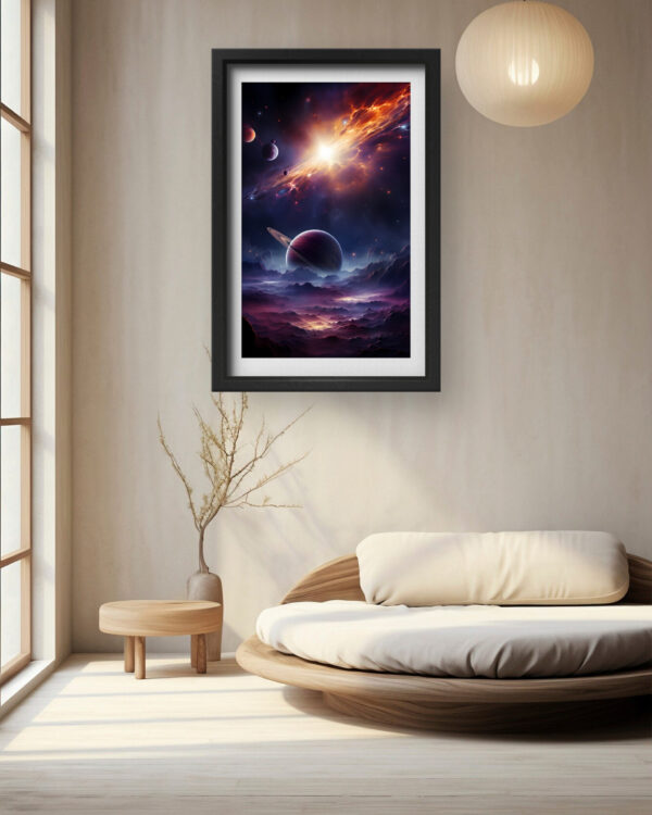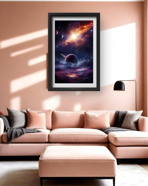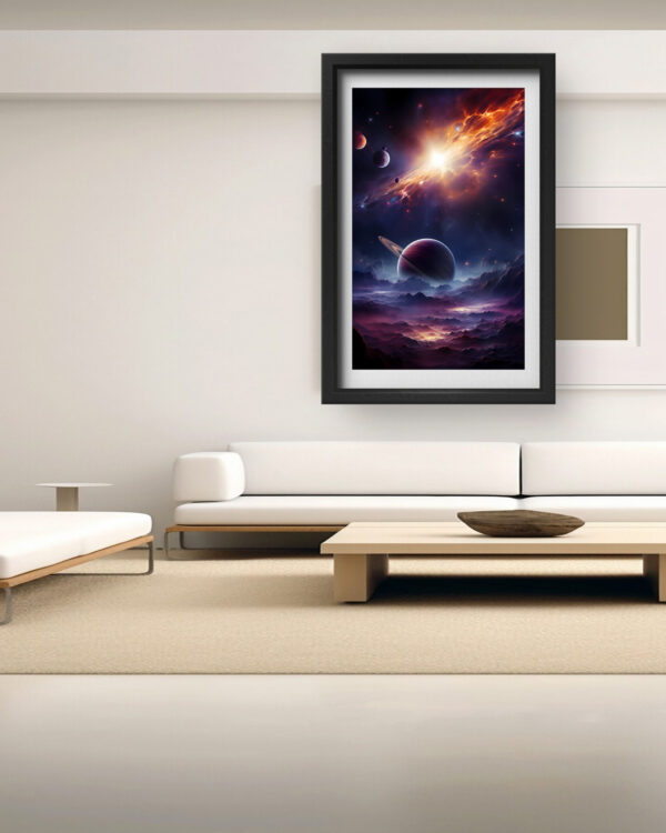 “Celestial Awakening” brings the infinite drama of space into your home, showcasing a brilliant cosmic eruption casting light over a distant planet and mountainous terrain. The fiery nebula and ringed gas giant hover in harmony with deep purples and oranges that stir imagination and awe. Enclosed in a sleek black frame with a white mat, this piece is perfect for statement walls, dreamers, and lovers of space fantasy. It’s not just a piece of art—it’s a glimpse into another universe.