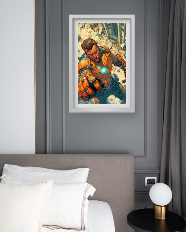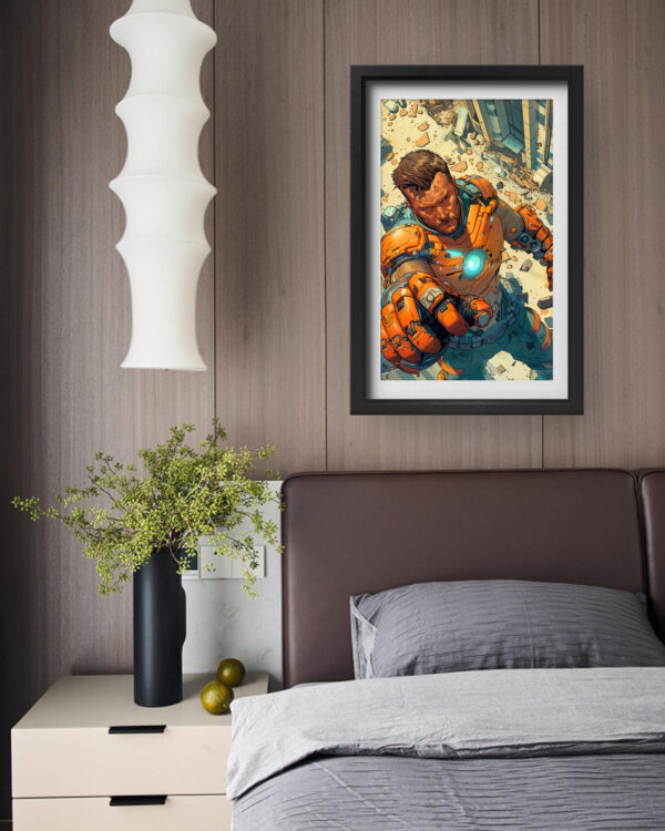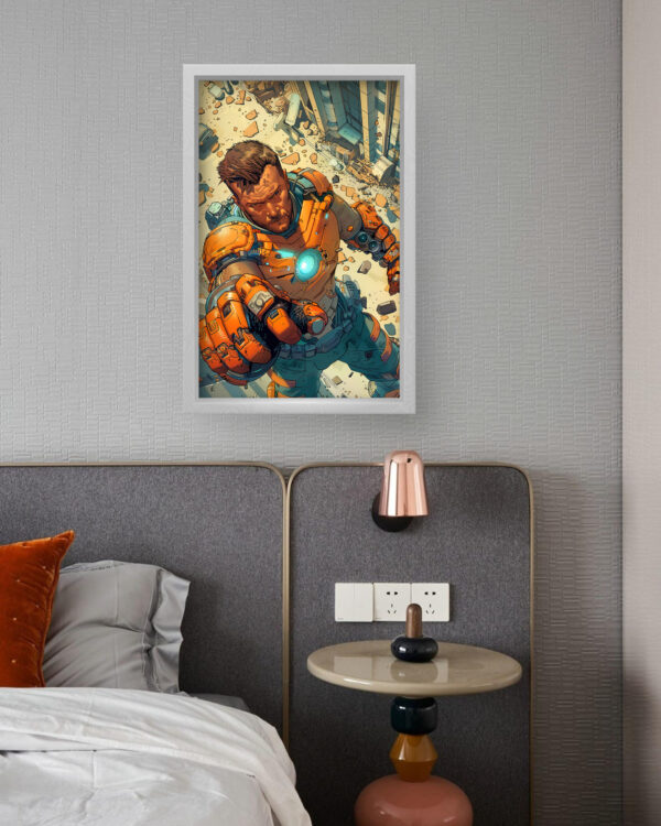 Cyber Hero Action Wall Art brings dynamic energy to your space with a bold and powerful superhero figure in high-tech armor. The detailed composition, rich in futuristic elements, portrays a warrior in action, set against a backdrop of destruction and chaos. The vibrant orange tones and glowing core create an electrifying presence, making this piece perfect for fans of sci-fi, gaming, and action-packed storytelling.