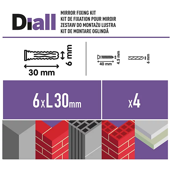 Securely mount your mirrors with ease using this Diall 12-Piece Mirror Fixing Kit. This all-in-one set is designed to work on various surfaces, offering universal wall plugs and corrosion-resistant materials for durability and a polished finish. Perfect for adding style and functionality to any space.
