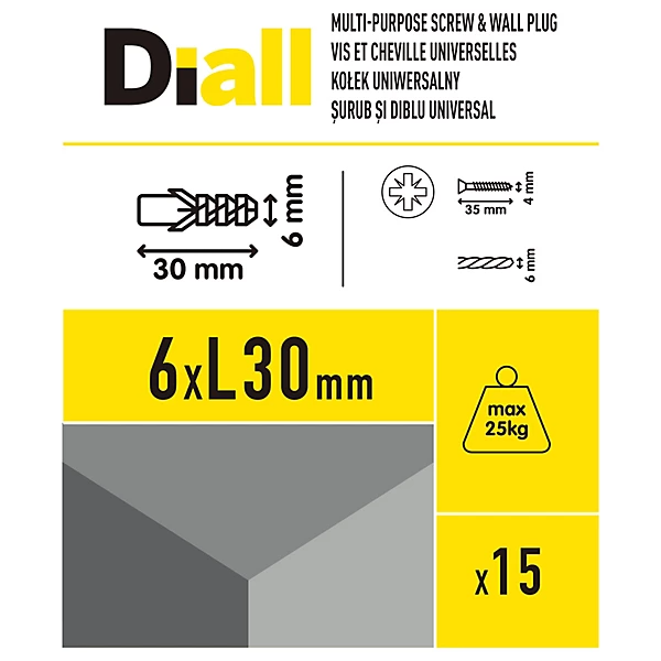 Diall Grey Multi-purpose screw & wall plug (Dia)6mm (L)30mm, Pack of 15