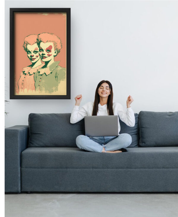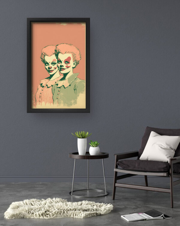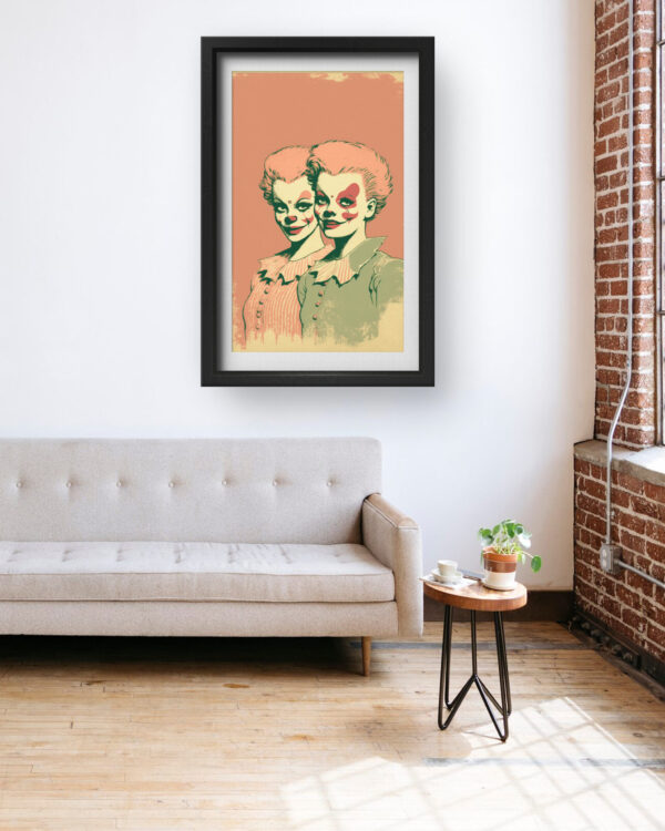 Dual Clown Identity Wall Art is a mind-bending blend of retro charm and surreal commentary. Featuring two identical women in vintage dress—one smiling, both with unsettling clown face paint—the piece evokes themes of identity, performance, and inner conflict. The muted pastel tones combined with faded textures give it a nostalgic yet eerie vibe.