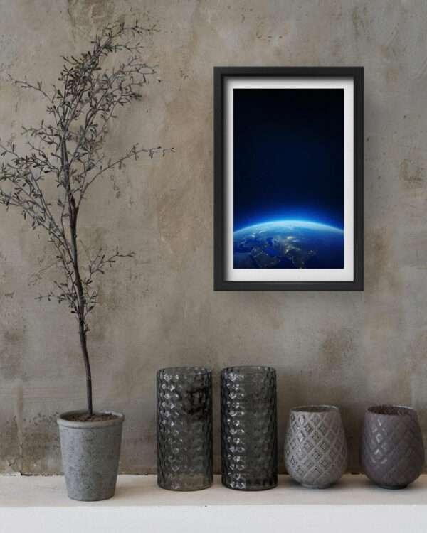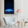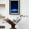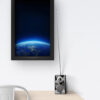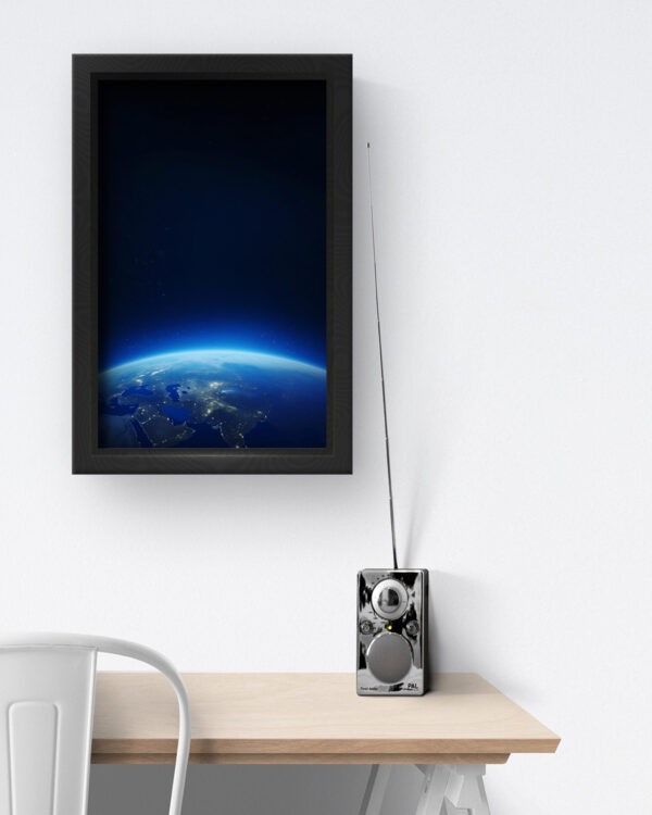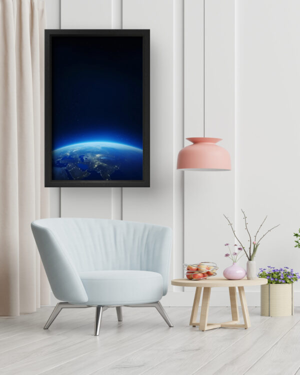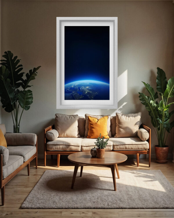 “Earthrise Glow” captures the awe-inspiring moment where the curvature of our planet emerges from the darkness of space, bathed in a gentle blue glow. The twinkling city lights and vibrant horizon evoke a sense of peace, perspective, and unity. Set in a sleek white frame, this piece blends serenity with science, making it a perfect fit for minimalist interiors, science lovers, or anyone who dreams beyond the stars.