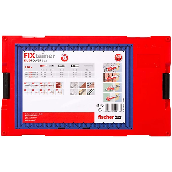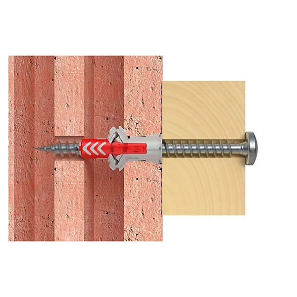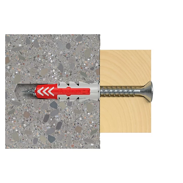 This Fischer DuoPower 210 piece wall plug set combines strength and versatility with its innovative dual-component design. The grey nylon core activates expansion, folding, or knotting functions based on the material, while the red wings enhance secure hold and safety. Engineered for optimal hold in a variety of materials, these plugs ensure secure, reliable fixings in both solid and hollow surfaces.