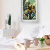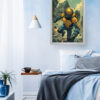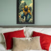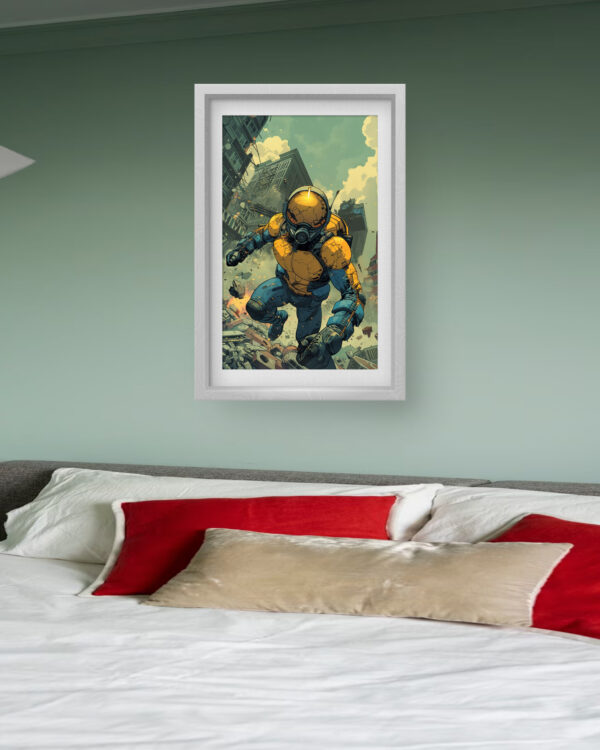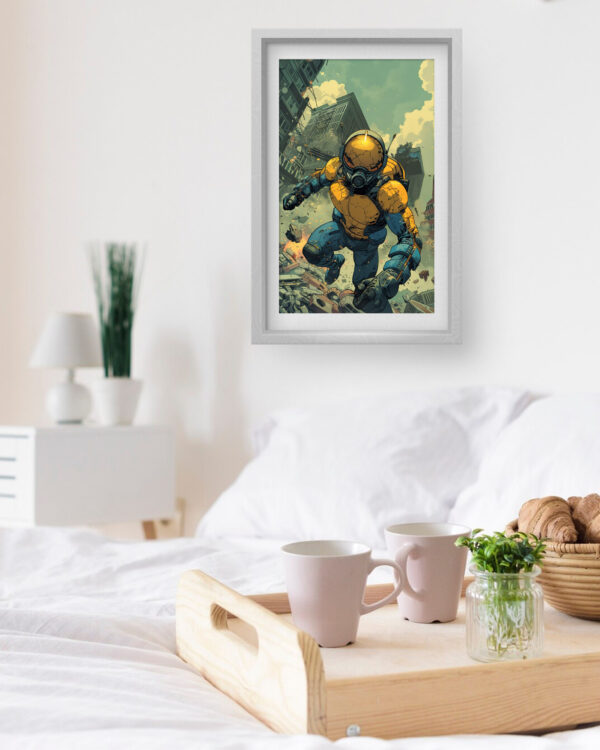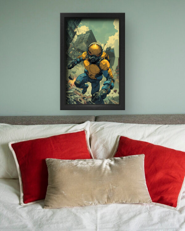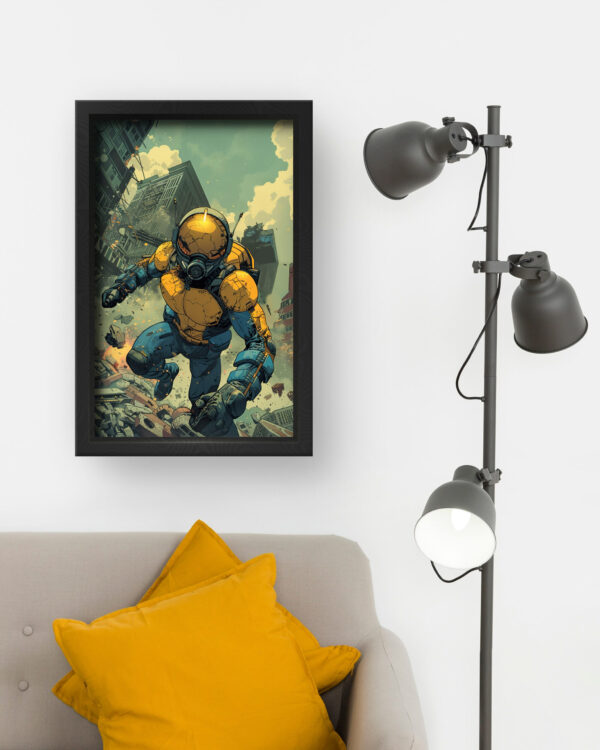 Futuristic Warrior Wall Art delivers an electrifying mix of sci-fi action and dystopian intensity. The artwork showcases a heavily armored futuristic soldier leaping through a crumbling cityscape, symbolizing resilience and power. The vibrant contrast of deep blues and bold yellows adds dynamic energy, making it a perfect statement piece for modern interiors.