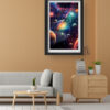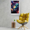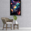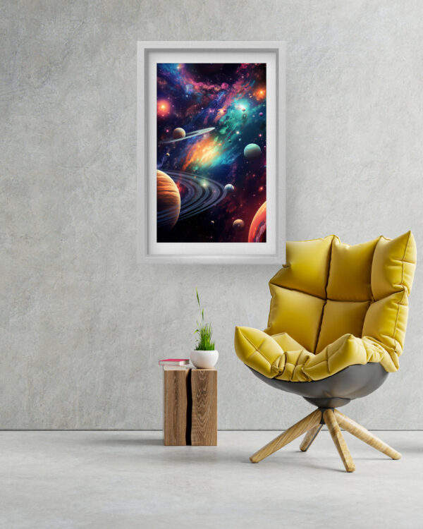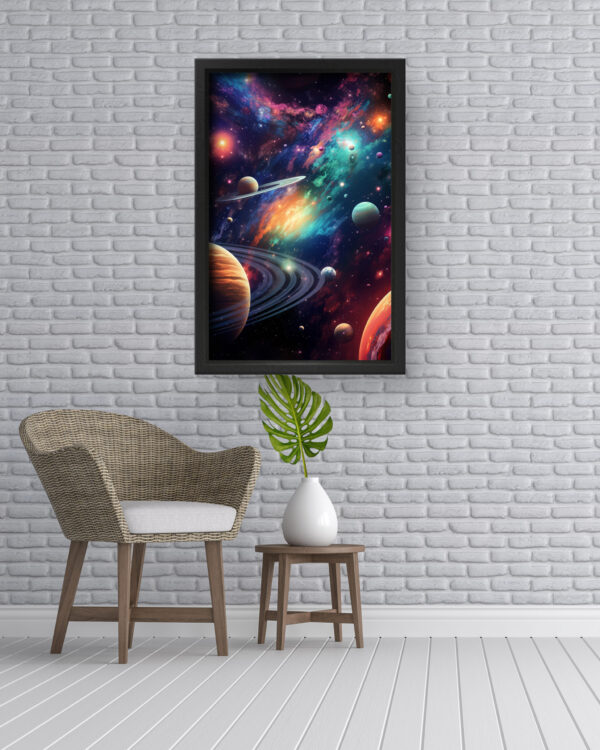 “Galactic Symphony” is a breathtaking explosion of color and cosmic wonder. This vivid artwork features a majestic array of planets and swirling rings set against a brilliant nebula backdrop. Bursts of teal, magenta, orange, and gold blend into an otherworldly spectacle, giving life to the mysteries of the universe. Perfect for creative spaces, kids’ rooms, or anyone who appreciates bold space-themed art, this piece will inspire curiosity and imagination every time you look at it.