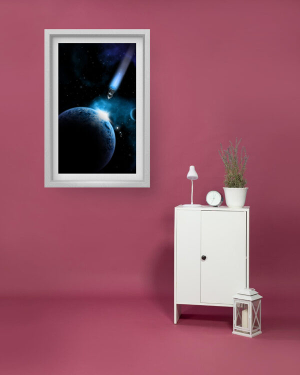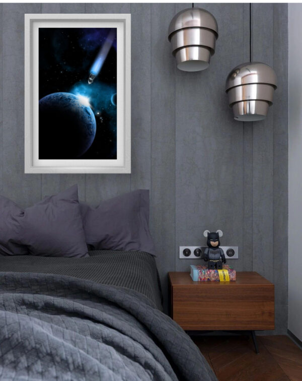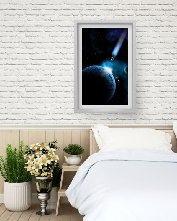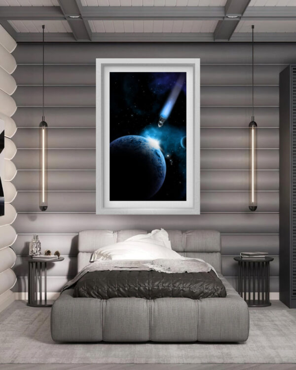 Galactic Voyage captures the essence of space exploration with a stunning depiction of a spacecraft venturing through the cosmos. The glowing blue planet, distant moons, and the spacecraft’s vibrant propulsion trail create an awe-inspiring visual that fuels the imagination. Perfect for sci-fi enthusiasts, dreamers, and space lovers, this artwork brings the thrill of interstellar travel into any modern living space, bedroom, or office. Elevate your decor with a piece that symbolizes adventure and the infinite possibilities beyond Earth.