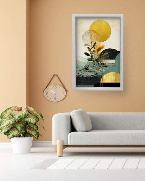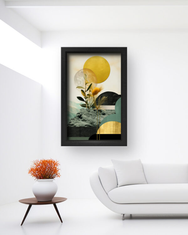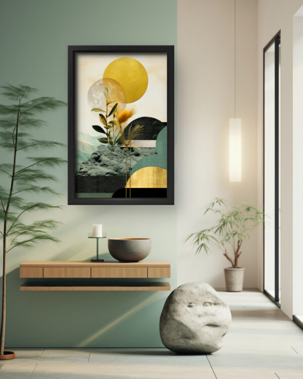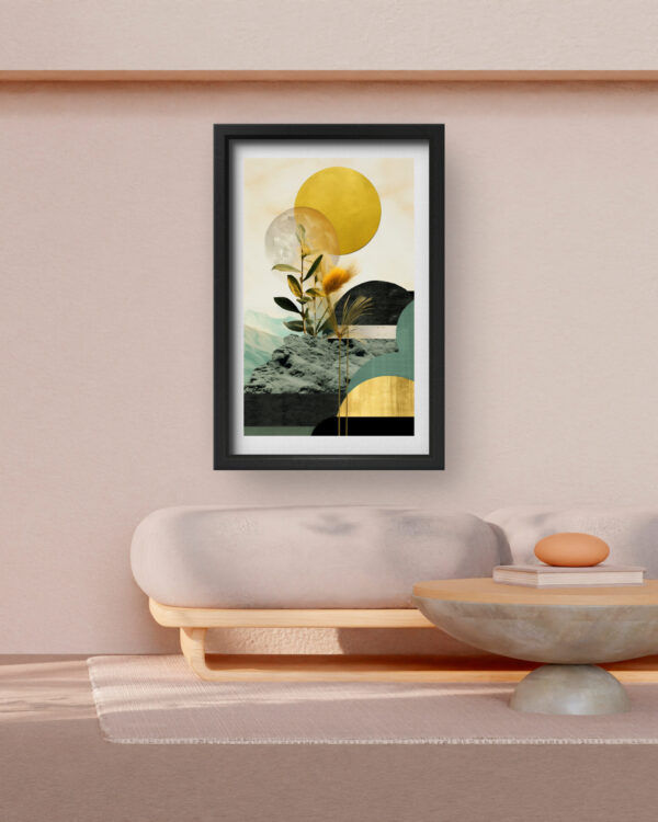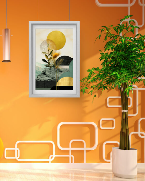 Golden Serenity Abstract Wall Art is a harmonious fusion of nature and contemporary aesthetics. This artwork features soft earthy tones, golden spheres, and abstract plant elements, creating a tranquil yet sophisticated visual appeal. The subtle textures and layered design evoke a sense of balance, making it an ideal piece for enhancing modern interiors.