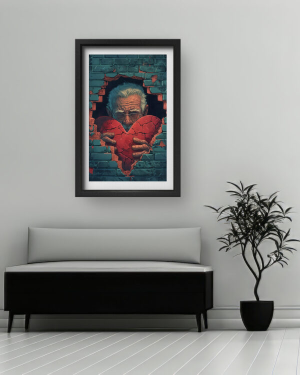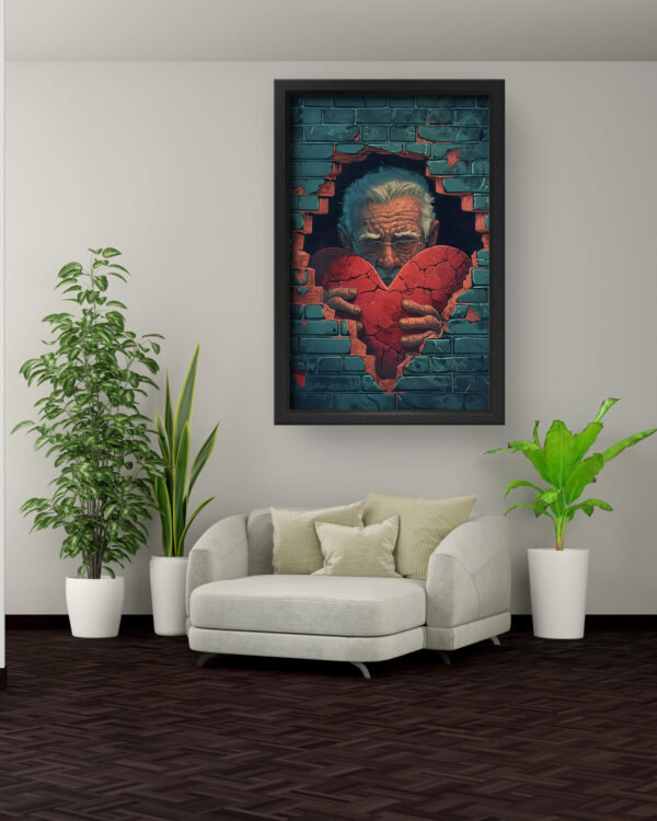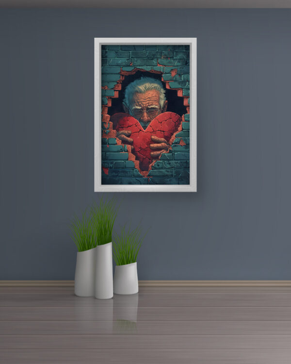 This deeply symbolic artwork captures an elderly man emerging through a broken brick wall, holding a shattered yet still beating heart. The contrasting tones of the rugged bricks, aged hands, and glowing red heart create a striking visual impact that conveys themes of resilience, love, and emotional vulnerability. A perfect addition to modern, thought-provoking decor, this piece invites reflection and conversation in any space. Printed on high-quality canvas, it offers rich colors and intricate details that stand the test of time.
