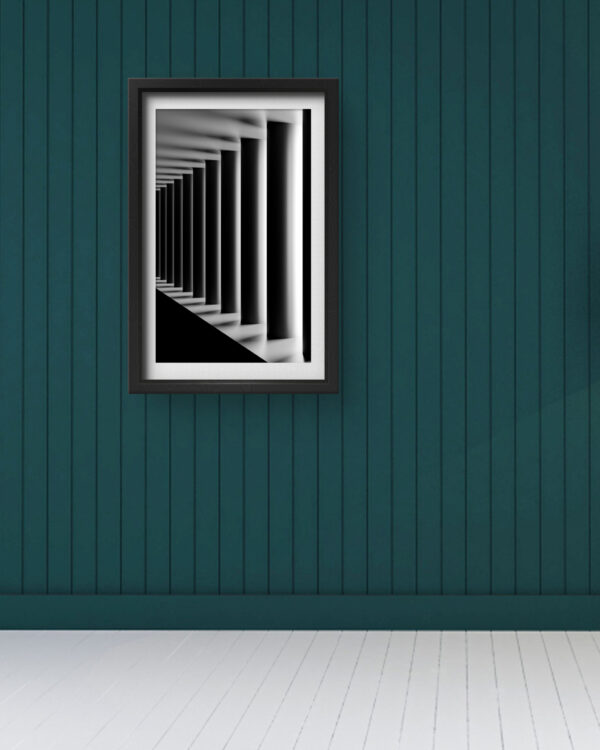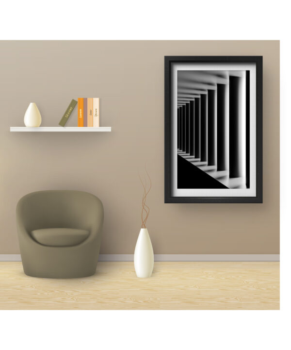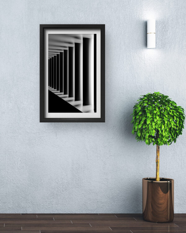 This mesmerizing piece of art plays with light, shadow, and geometry to create a striking visual effect. The symmetrical arrangement of pillars fading into the distance gives a sense of infinity and depth, making it an ideal statement piece for modern, minimalist, or contemporary interiors. Whether placed in an office, hallway, or living room, this artwork invites the viewer to explore the illusion of space and endless possibilities.