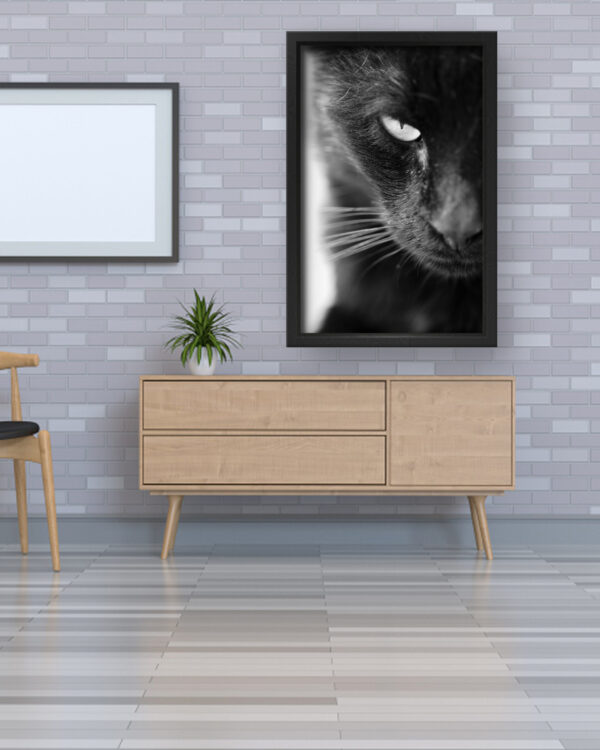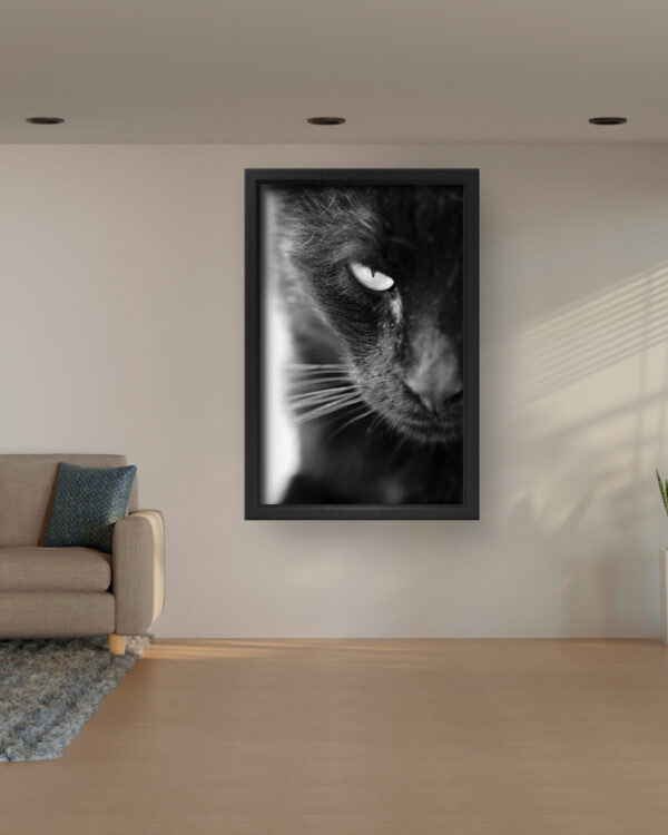 Intense Gaze captures the essence of feline mystery and power through a dramatic black and white close-up. The sharp focus on the cat’s eyes draws the viewer into a world of quiet contemplation and fierce determination. The high contrast enhances the depth of its gaze, making it an excellent statement piece for modern, minimalist, or animal-inspired interiors. Whether you’re a cat lover or an admirer of bold artistic expressions, this artwork will add intrigue and elegance to any space.