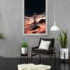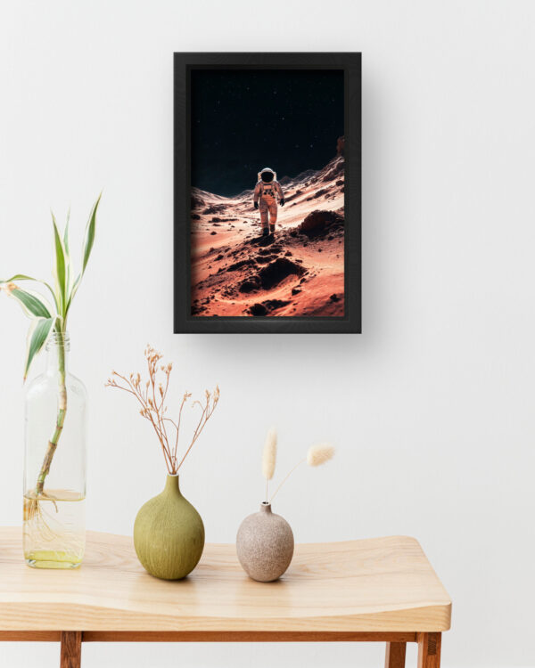 “Martian Stroll” offers a breathtaking scene of a solitary astronaut trekking through a striking red landscape that resembles the surface of Mars. The detailed textures of the terrain contrast beautifully with the vast, star-filled black sky, creating a powerful visual narrative of space exploration and adventure. Housed in a sleek black-and-white frame, this piece makes a bold statement in modern homes, tech-inspired offices, or any space enthusiast’s collection.