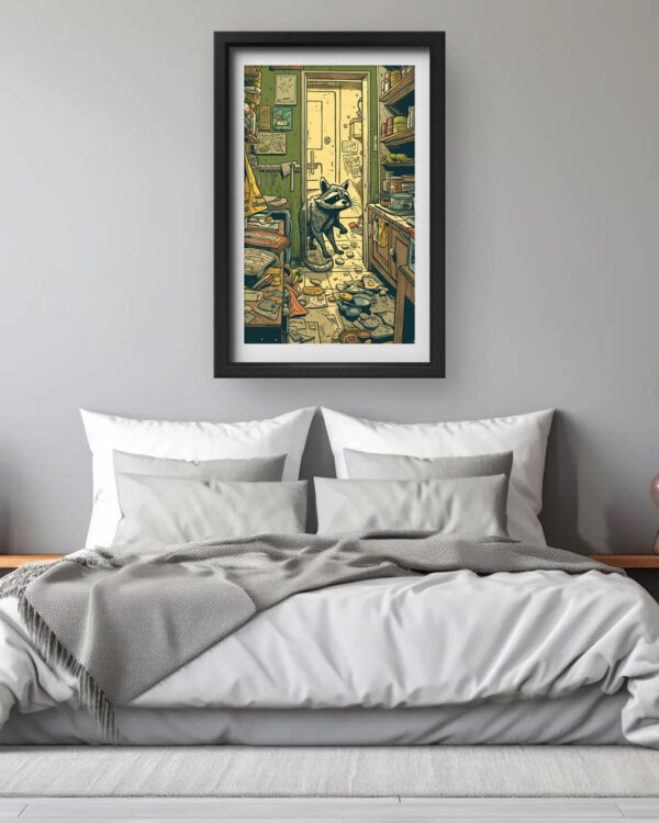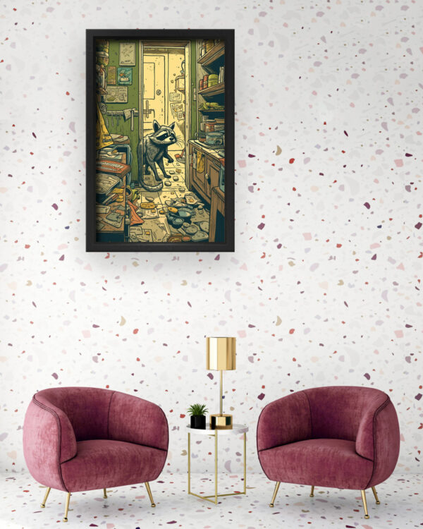 Midnight Mischief Wall Art tells a story through rich details and warm, nostalgic tones. Featuring a mischievous raccoon caught in the act of exploring a chaotic kitchen, this artwork blends realism with a whimsical, storybook-like atmosphere. The intricate linework and muted palette create a vintage-inspired aesthetic that sparks curiosity and imagination.