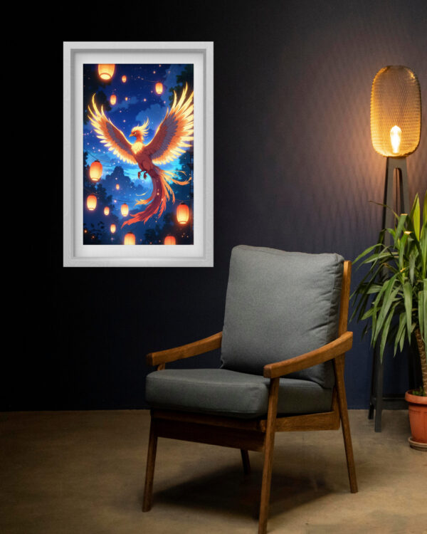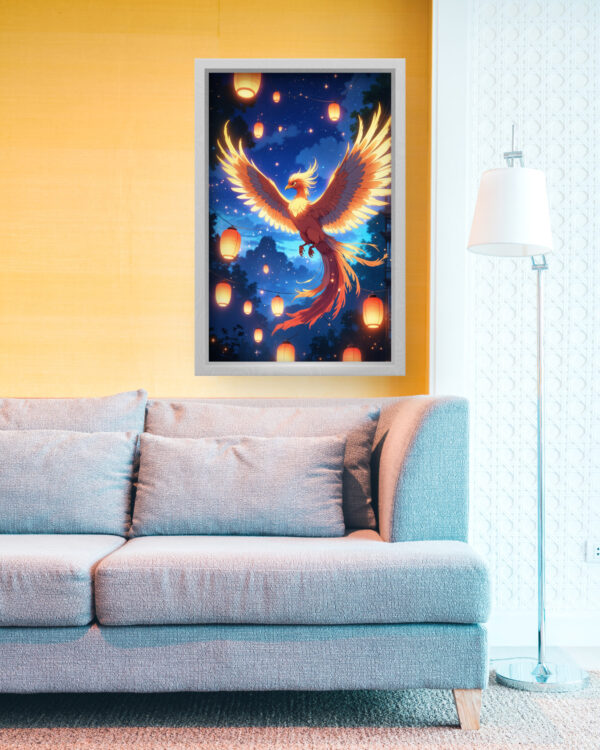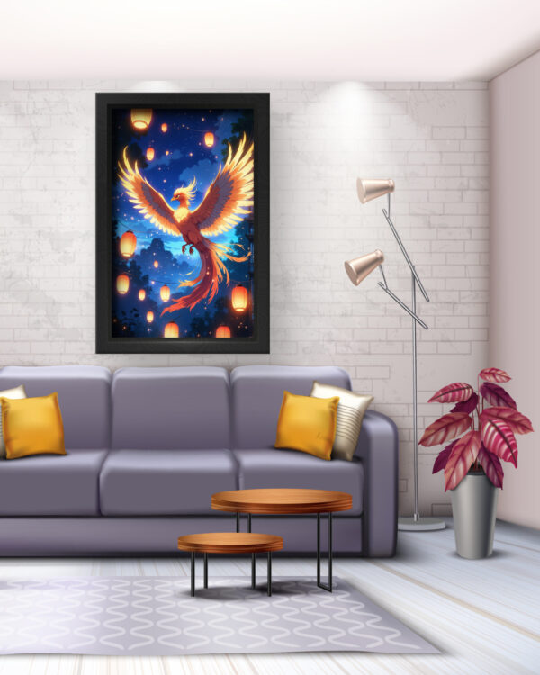 Bring the legendary symbolism of the phoenix into your decor with this Phoenix Rising Lanterns wall art. This breathtaking artwork showcases a fiery phoenix ascending into the starlit sky, surrounded by floating lanterns that cast a warm, ethereal glow. The vivid contrast between the deep blues of the night and the golden radiance of the flames creates a magical and dynamic composition. Perfect for those who appreciate mythical themes, spiritual growth, or artistic fantasy, this high-quality canvas print serves as an inspiring focal point for living spaces, offices, or creative environments. Let this stunning piece remind you of resilience, renewal, and the power of transformation.