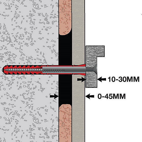Heavy duty fixing for dot and dab or drylined walls for all brick and block types. Steel core bridges the gap and transfers load to the blockwork. Ideal for large TVs, wall units, shelves, boilers and radiators.