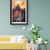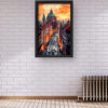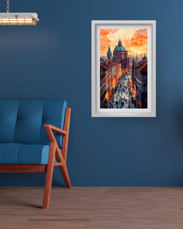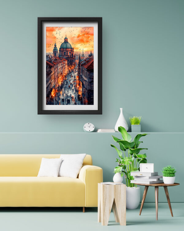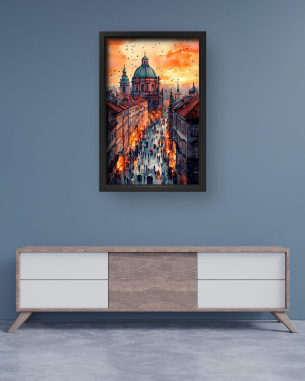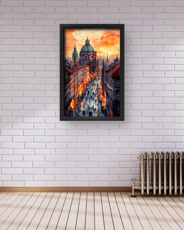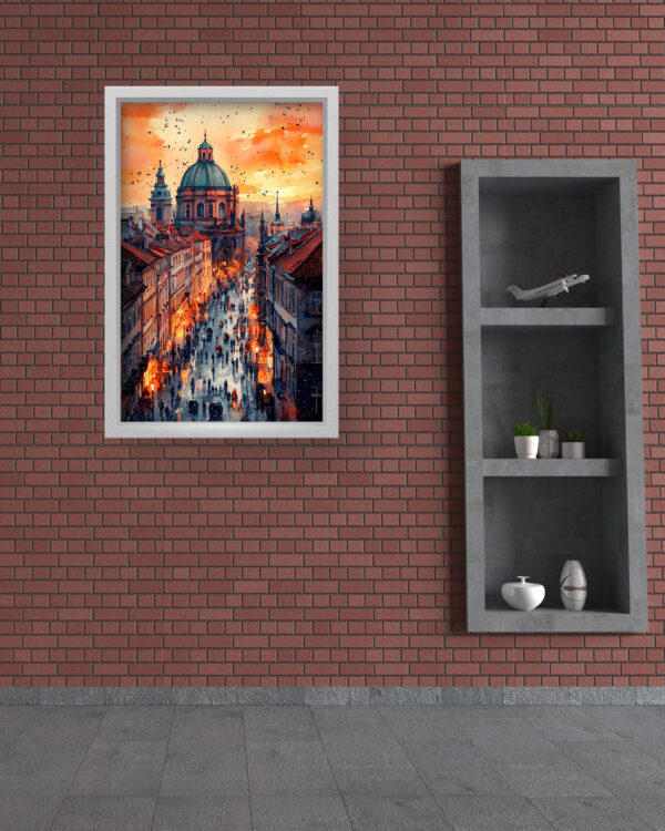This stunning art piece captures the charm of Prague’s Old Town, featuring cobbled streets bathed in the golden hues of sunset. The illuminated street lamps and silhouettes of people bring the city to life, with the grandeur of St. Francis of Assisi Church standing tall in the background. The intricate detailing and vibrant contrast between warm and cool tones create a visually striking piece that blends nostalgia and modern digital artistry. Ideal for lovers of European architecture and historical cities, this premium-quality canvas print adds a sense of timeless beauty to any space.