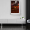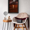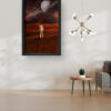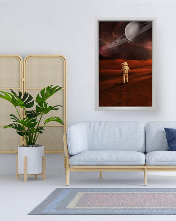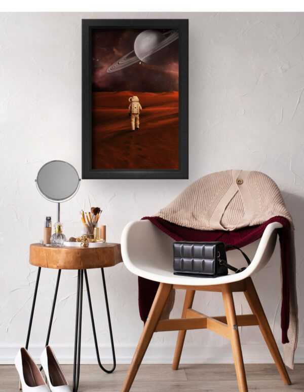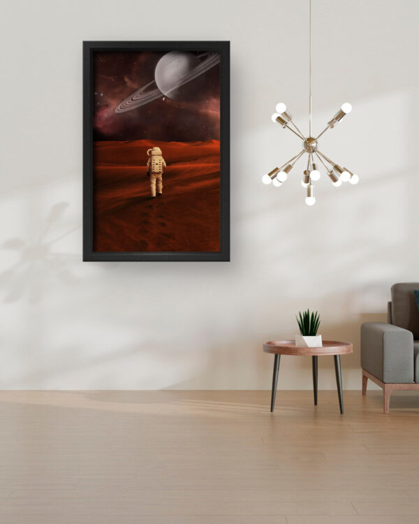 “Saturn Dreams” captures a moment of profound solitude and cosmic wonder. A single astronaut walks across a deep red alien desert, leaving footprints that fade into the horizon. Above, Saturn looms large and luminous, its rings glowing softly against a maroon sky sprinkled with stars. This piece evokes themes of exploration, discovery, and the quiet beauty of the unknown. Framed in classic black, it’s a captivating addition for space enthusiasts and dreamers alike, ideal for modern interiors seeking a bold yet contemplative touch.