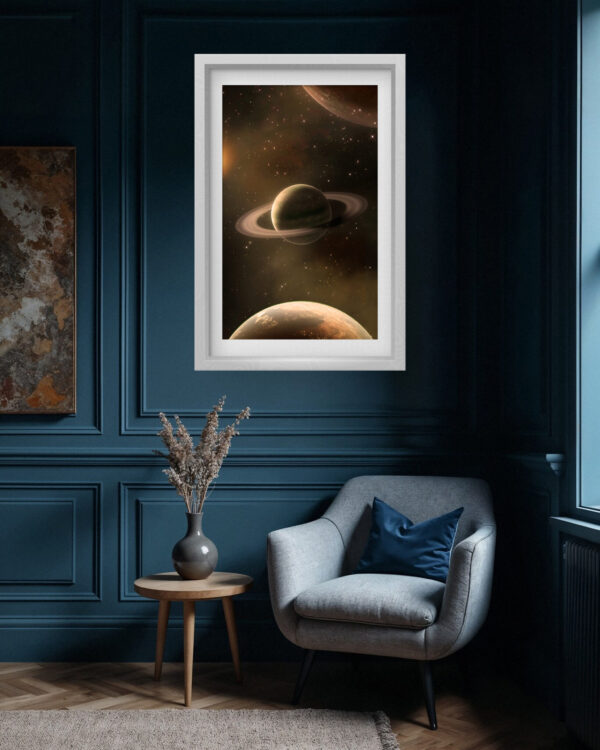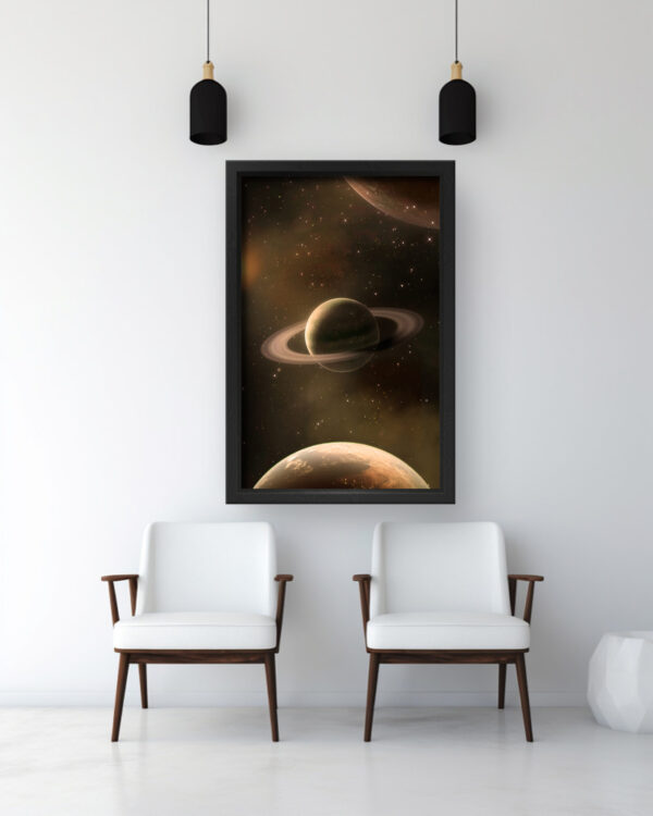“Saturn’s Serenity” draws you into a tranquil corner of the universe where ringed giants drift gracefully through a golden, stardust-filled void. This artwork captures the majestic calm of outer space with warm earthy tones, soft glows, and a mesmerizing play of light and shadow. Perfect for minimalist, modern, or moody interior designs, this piece brings a peaceful yet powerful celestial vibe into your room. Whether you’re a stargazer or a design lover, this framed print makes a stunning focal point.