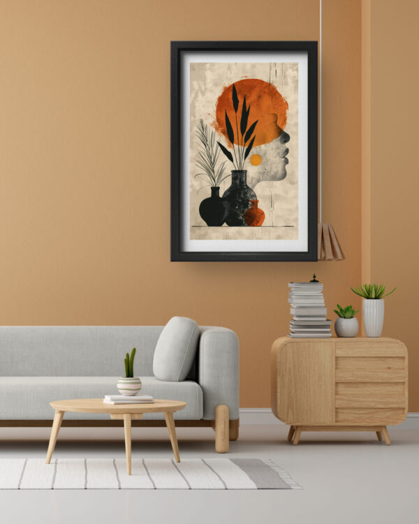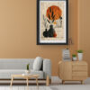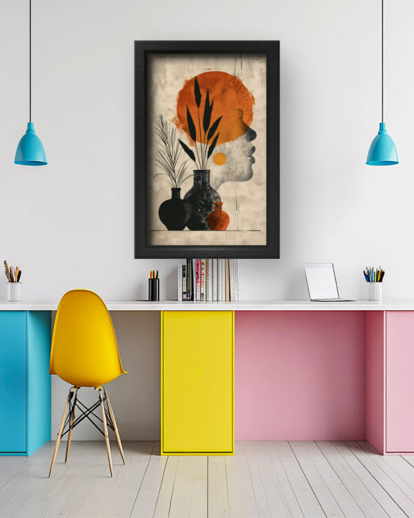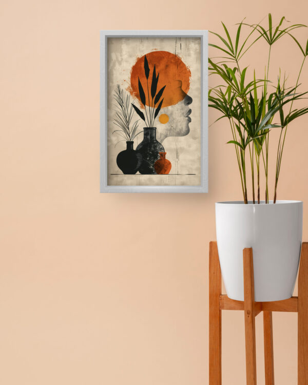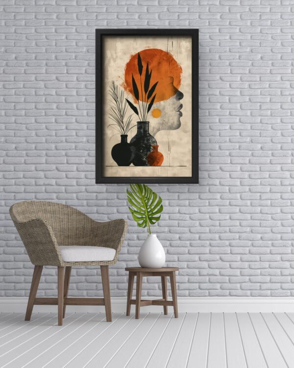 Bohemian Silhouette is an evocative piece that blends human form with nature, featuring a striking side profile adorned with earthy tones, bold orange hues, and textured botanical elements. The rich, rustic palette and abstract brush strokes create a modern yet tribal aesthetic, making it a perfect statement piece for creative spaces, bohemian interiors, and contemporary workspaces. This artwork captures the essence of individuality and cultural inspiration, bringing warmth and depth to any room.