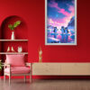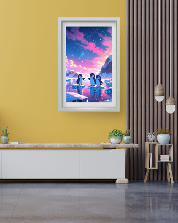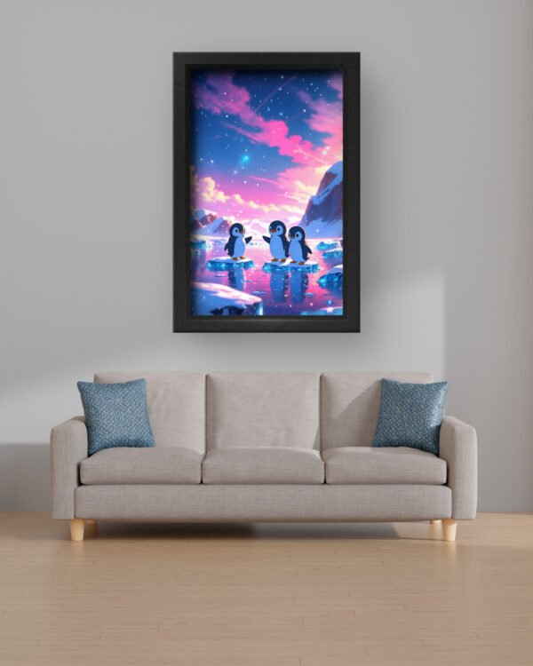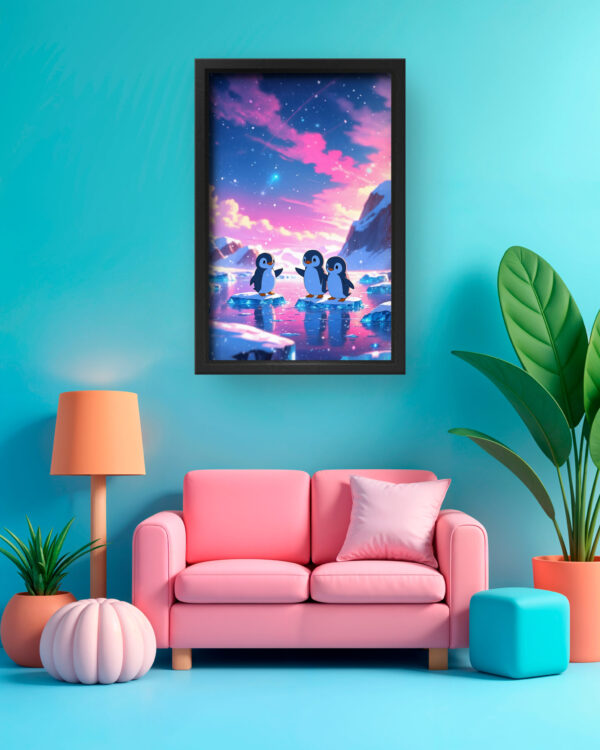 Transform your space with the enchanting beauty of this Whimsical Penguin Nightscape wall art. This delightful artwork captures three cute penguins balancing on floating ice, set against a stunning celestial sky painted with shades of pink, purple, and blue. The soft glow of the stars and the dreamy reflections on the water create a fantastical and joyful atmosphere. Perfect for nurseries, kids’ rooms, or any space that could use a touch of fun and imagination, this high-quality canvas print adds warmth, happiness, and wonder to your decor. Let these charming little penguins bring a smile to your face every day!