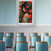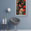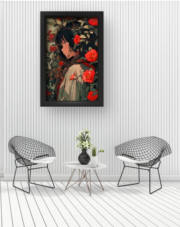 “Whispers of Bloom” is a graceful composition that blends soft anime-style character design with lush floral elements. A thoughtful young woman stands enveloped in a cascade of vivid red flowers and green foliage, creating a rich tapestry of nature and introspection. This piece brings both color and calm to any space—perfect for bedrooms, reading nooks, or art-inspired living rooms.